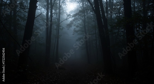 Naklejka premium Fogshrouded forest path dark trees frame a misty clearing