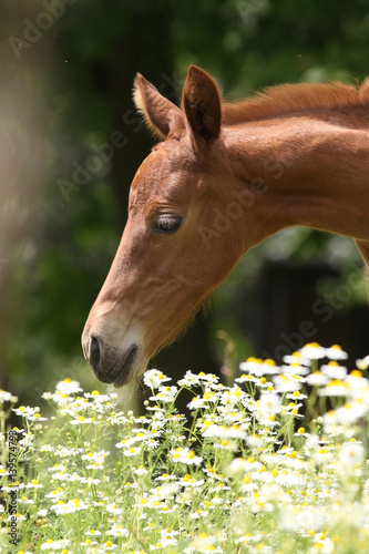 © Nadine Haase, Fototapeta premium Fohlen riecht an Blumen