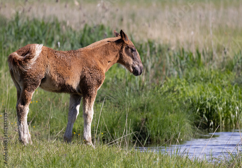 Fototapeta premium Fohlen steht vor wassergraben