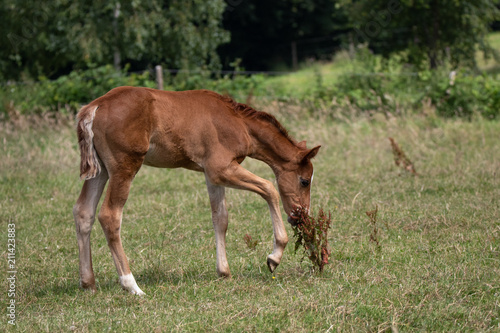 © mavcon, Fototapeta premium Fohlen untersucht Pflanze auch mit dem Vorderbein
