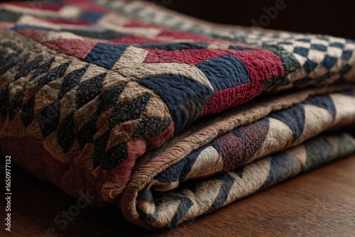 © Omnix, Fototapeta premium Folded patchwork quilt on wooden surface, indoor setting. Cozy home textile