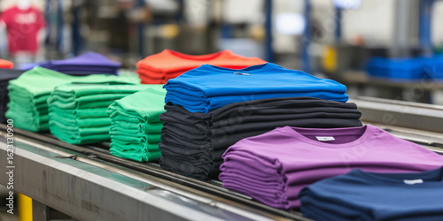 © plysuikvv, Obraz premium Folded t-shirts arranged on a factory conveyor belt Generative AI