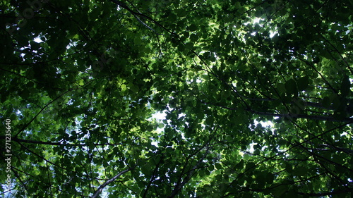 © Payllik, Fototapeta premium Foliage against the sky. Green European deciduous forest. Summer thicket landscape.