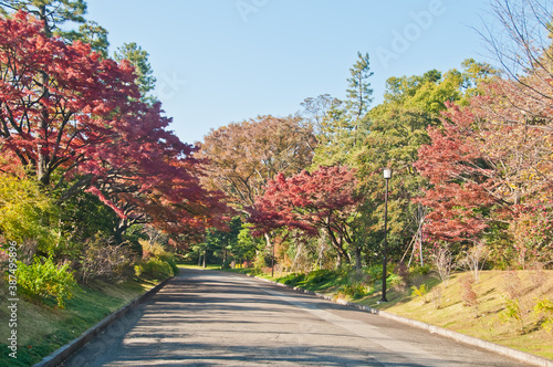 Naklejka premium Foliage Autumn leaves in red orange yellow and green colour on a sunny day with a long empty road in Tokyo Japan