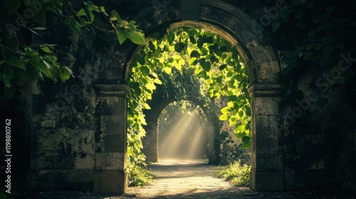 © sirisakboakaew, Obraz premium Foliage-covered stone archway with sunlight filtering through green leaves