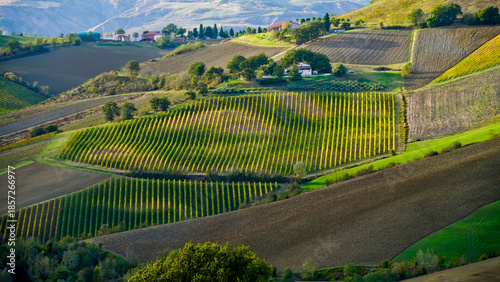 © anghifoto, Fototapeta premium Foliage d'autunno nei vigneti del vino Sangiovese delle colline bolognesi. Imola, Bologna, Emilia Romagna. Italia