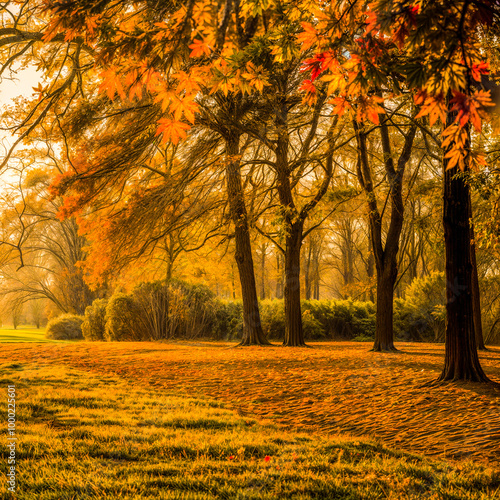 © Haseeb, Fototapeta premium Foliage in the park. Autumn fall leaves of maple trees. Autumn fall leaves in sunlight. Natural autumn background. Autumnal background. Foliage, falling leaves background. Autumn leaf. Autumnal mood.