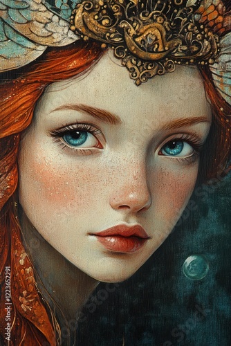 © Daria Sauer, Naklejka premium Folk Russian Illustration of The Little Mermaid with Red Hair and Underwater Elements