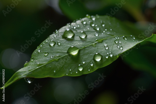 © Maelgoa, Fototapeta premium Fond d'écran avec la rosée du matin sur la feuille d'un arbre » IA générative