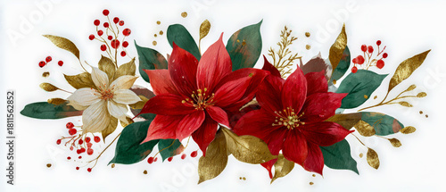 © Helena GARCIA, Naklejka premium Fondo horizontal con arreglo floral navideño de hojas verdes, doradas y flores de pascua rojas y blancas, frutos de acebo rojo sobre fondo blanco