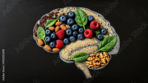 Fototapeta premium Food brain assembled with berries nuts and grains on blackboard.