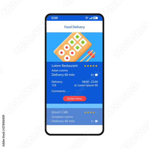 © IMG visuals icons, Fototapeta premium Food delivery smartphone interface vector template. Mobile app page blue design layout. Online chinese food ordering screen. Flat UI for application. Sushi bar, restaurant menu. Phone display