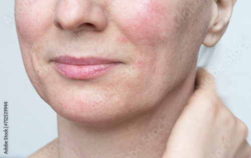 © Olena Poberezhna, Obraz premium Food for healthy facial skin. Allergic reaction to unhealthy diet, acne. Facial skin care concept.