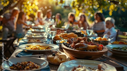 © Яна Ерік Татевосян, Naklejka premium Food outside on tables in the garden. Selective focus.