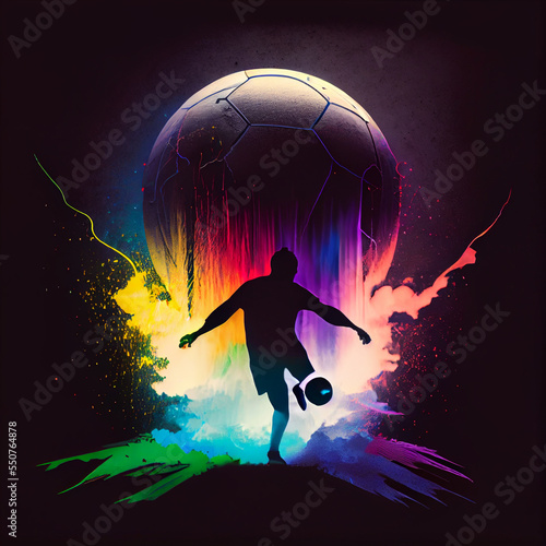 Naklejka premium Football and Soccer celebration of the World Cup, flaming balls and lighting, with rainbow colors
