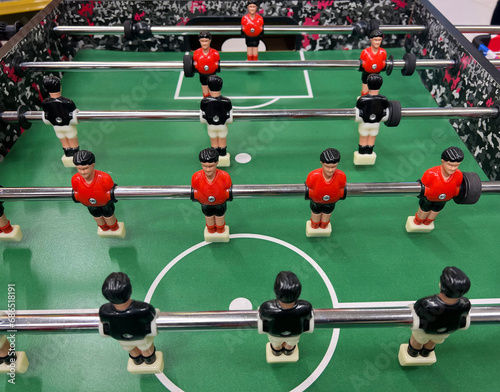 Fototapeta premium Football - board game with players, soccer ball and green field. Foosball table, close-up.