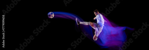 © Lustre Art Group , Fototapeta premium Football player performing kick with ball trajectory motion blur. Concept of athletic performance, movement analysis, and design visuals for sports gear promotion and education. Banner