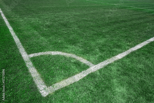 Obraz premium Football soccer field corner with white marks, green grass texture.