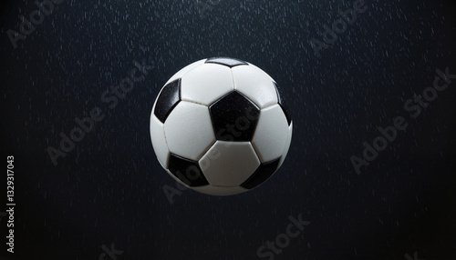© Iryna, Fototapeta premium Football suspended mid-air in a torrential rain, showcasing motion and intensity