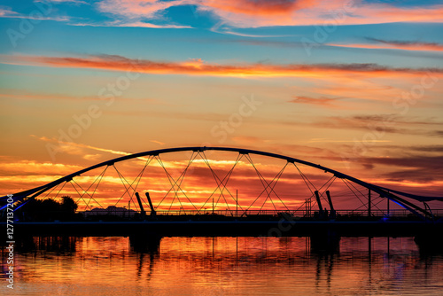 Naklejka premium Footbridge across Tempe Town Lake in Tempe Arizona at dusk with sunset