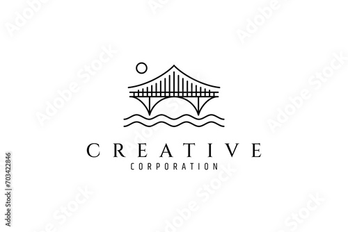 © FendyTerisno, Fototapeta premium Footbridge logo with water waves in outline linear vector template design style