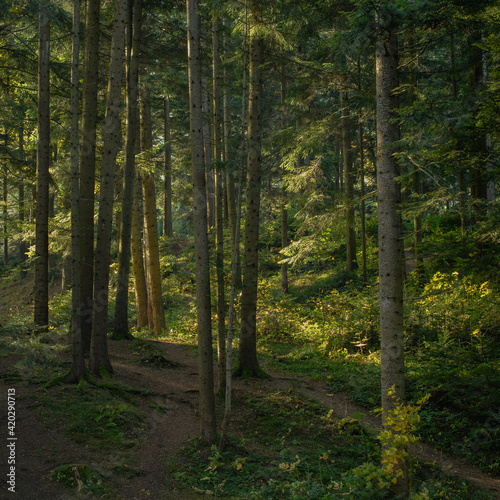 © Dmytro Hai, Obraz premium Footpath between trees in mountain forest