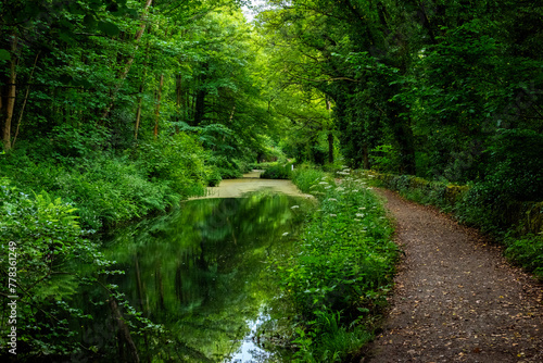 Naklejka premium Footpath by a very green Cromford Canal in Whatstandwell near Matlock in...