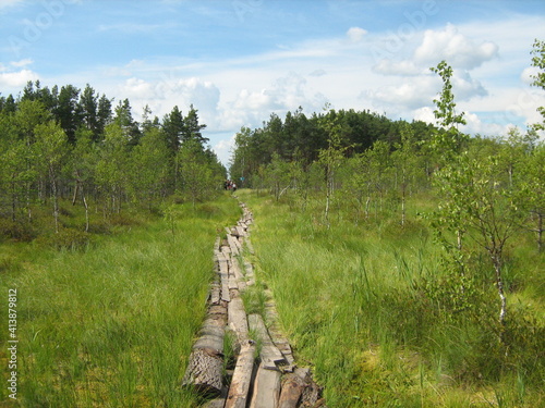 © Владимир, Fototapeta premium footpath from the boards in the middle of the swamp to the forest