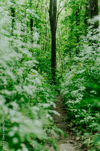 Fototapeta premium Footpath in peaceful forest, lush with trees and flowering shrubs