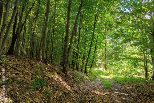 © Pellinni, Fototapeta premium footpath through ancient beech forest in dappled light. beautiful nature of carpathians in summer