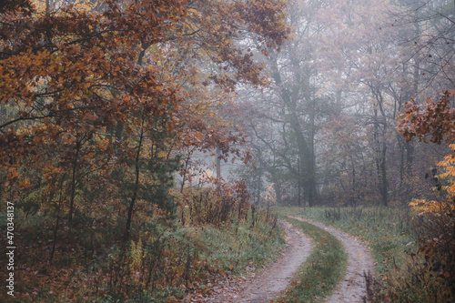 © Lukasz, Obraz premium Footpath through autumn, foggy forest.
