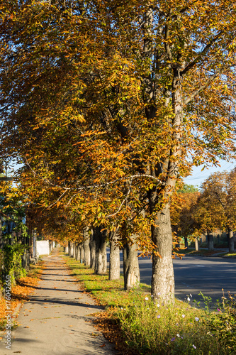 © olyasolodenko, Fototapeta premium Footpath with chestnut trees on autumn