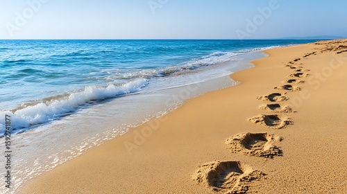 © Nurul, Obraz premium Footprints in the Sand Leading Along the Beach Towards Ocean