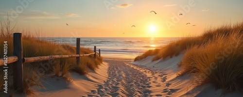 © Maryna, Naklejka premium Footprints trail across sand towards the ocean. Coastal pathway leads to the sea under a golden sunset sky. Nature illustration features beach grass and wooden fence.