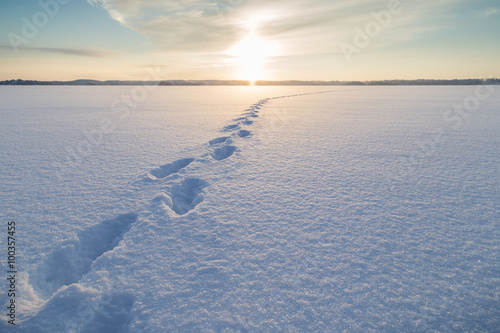 Naklejka premium Footsteps on snow at a frozen lake in Finland at a sunny day in the winter.