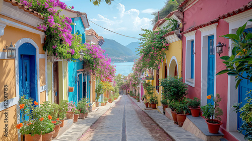 Naklejka premium For a relaxing spring trip, happy travelers explore the charming town. Spring flowers bloom along the streets, capturing the essence of tranquility and beauty in this rejuvenating season.