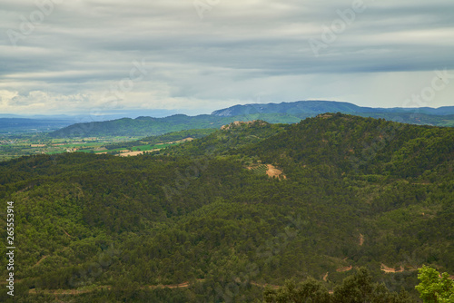 © Natura, Fototapeta premium Forêt à perte de vue et au loin un village perché sur la colline