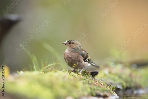 Obraz premium Foraging female common chaffinch (Fringilla coelebs) on mossy fo
