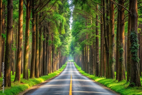 © suchetpong, Obraz premium Forced perspective of road through dense forest with tall trees