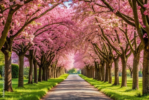 © suchetpong, Naklejka premium Forced perspective photo featuring a path lined with pink and white flowers leading to a tree lined road