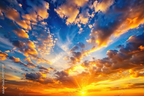 Fototapeta premium Forced perspective sunset with orange yellow sunlight on blue sky background