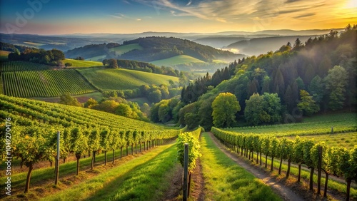 © Pawina, Fototapeta premium Forced perspective vineyard overlooking valley and forest