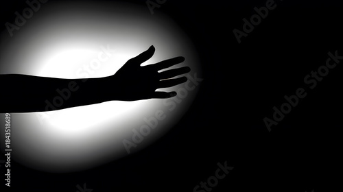 Obraz premium forearm. Silhouetted forearm reaching toward a light source against a dark gradient background. wellbeing guides, coaching materials, designed for mental health education and mindfulness programs.
