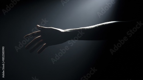 Obraz premium forearm. Silhouetted forearm reaching toward a light source against a dark gradient background. wellbeing guides, coaching materials, designed for mental health education and mindfulness programs.