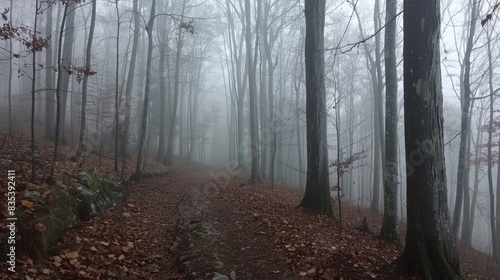 Naklejka premium Foreboding Forest Path Under Heavy Mist - Nightmare Motif Design for Posters...