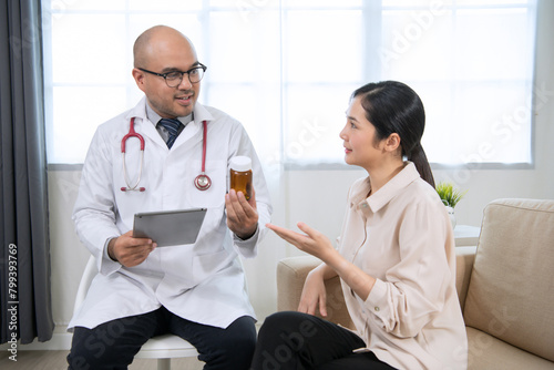 © PhugunStock, Fototapeta premium Foreign tanned male doctor in white medical clothes discussing woman's illness male doctor opens an iPad, shows treatment and medication information, and provides information of each drug.