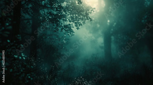 Obraz premium forest, a bright light in the distance, a heartwarming feeling, dark green...