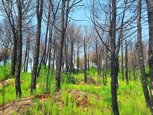 © Tanya, Fototapeta premium Forest after fire with black trees and green grass against blue sky.