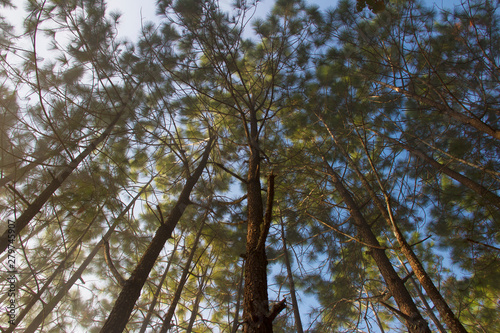 © Montree, Fototapeta premium Forest and branches of pine trees with morning mist natural background.