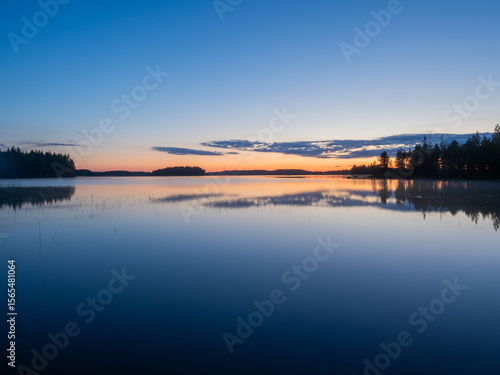 © Igor Podgorny, Fototapeta premium Forest and clouds are reflected in the calm water of a lake in Karelia during the white nights. White night in Karelia, northwest Russia